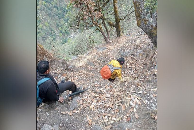 बझाङ । चट्टानै चट्टान भएको भीरमा साँघुरो बाटो। यताउता फर्कनै नमिल्ने। माथि हेर्दा चट्टान खस्ला झैँ, तल हेर्दा आँङै सिरिङ हुने। त्यही बाटोमा भारी बोकेर यात्रा गर्छन्, तलकोट गाउँपालिका–२ रुवातोलाका गोविन्द बोहरा। उनी हरेक महिना छ-सातपटक गह्रुँगो भारीसहित तीन दिन पैदलयात्रा गरेर साइपाल पुग्छन्। भारी बोकेरै जीविकोपार्जन गर्ने उनलाई सरकारले रोजगारी दिएन भन्ने गुनासो छैन। सरकारले बाटो मात्रै बनाइदिए ठूलो कुरा हुने बोहराको भनाइ छ। ‘जीविकोपार्जनका लागि साइपालको भारी बोक्नुपर्छ’, उनले भने, ‘साइपालमा भारी बोकेर जान सबैभन्दा समस्या यही बाटोमा हुन्छ। पालिकाले रोजगारी नदिए पनि बाटो मात्रै बनाइदिए हामीलाई ठूलो राहत हुने थियो।’ रूपातोलाको किर्किट्याबाट अहिलेसम्म बाटो काटिएको छैन। चट्टान तथा पहिराको बीचमा चौपायाले टेकेका पाइलामा पाइला मिलाएर यात्रा गरेको पनि पाँच वर्ष भइसक्यो। मानवबस्तीको सबैभन्दा अन्तिम गाउँ साइपालको न्यूना, बलौडी तथा धुलीका लागि पिठ्यूँमा भारी बोक्दै हिँड्ने उनलाई सबैभन्दा कठिन यात्रा कालडाँडासम्मको लाग्छ। कालडाँडादेखि किर्किट्यासम्मको दूरी झन्डै २५ किलोमिटर छ। ‘यो बाटोमा संयमता नअपनाए कोही पनि फर्केर आउन सक्दैन’, बोहराले भने, ‘भारी पिठ्यूँमा बोकेर एकछिन पनि पर्खन सकिन्न। माथिबाट ढुङ्गा खस्ला भन्ने डर, तलबाट खुट्टा चिप्लिने डर। संयोगवश अहिलेसम्म दुःखद खबर भएको छैन।’ बोहराका अनुसार रूपातोलाको किर्किट्याबाट भारी बोकेर कालडाँडा पुग्न १२ घण्टा लाग्छ। ‘कालडाँडा तलको खोला (ठूले खोला) सम्म पुग्नै साढे पाँच घण्टा लाग्छ। त्यसपछि उकालै उकालो। त्यो यात्रा पार गरेपछि भने बाँचे जस्तै लाग्छ’, उनले भने। गैरीडाँडामा भेटिए, रूपातोलाका दीपक बोहरा। गैरीडाँडा कालडाँडा र ठूले खोलाको बीचमा पर्छ। उनी साइपालको न्यूनामा बन्दै गरेको घरको रडसहित सामान बोकेर आएका हुन्। कालडाँडा पुग्न यहाँबाट साढे दुई घण्टा हिँड्नुपर्छ। ‘जोखिम बाटोको बढी भाग त काटेँ। कालडाँडा पुगेपछि मात्रै साइपाल पुगेजस्तै हुन्छ’, उनले भने। दीपकले कालडाँडा पुगेपछि साइपाल जाने बाटो भने केही सहज भएको बताए। साइपालको न्यूना गाउँ पुग्न कालडाँडाबाट झन्डै १० घण्टा उकालो ओरालो हिँड्नुपर्छ। ‘साइपालले फराकिलो बाटो बनाएको हुँदा जता पनि भारी बिसाउन सकिन्छ। आराम गर्दै हिँड्न सकिने भएकाले बाटोको समस्या हुँदैन’, उनले भने। दीपक हरेक महिनामा चारपाँच पटक त्यही बाटो ओहरदोहर गर्छन्। धुलीसम्म भारी बोकेर परिवारको गुजारा गर्छन्। दीपकले भने, ‘तीन–चार दिनको यात्रा गरेर धुलीसम्म पुर्याएको सामानको ज्यालाले परिवार पाल्नुपर्छ।’ उनले भारी बोकेको पैसाबाट कर तिरिरहेको बताउँदै सरका