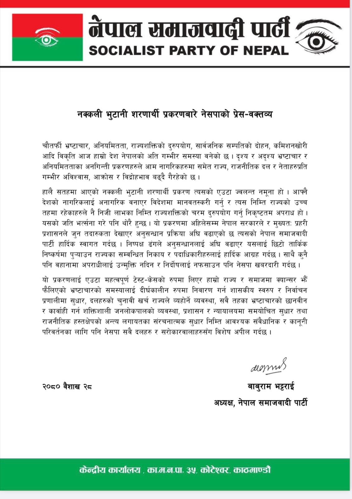 काठमाडौं ।नेपाल समाजवादी पार्टीका अध्यक्ष बाबुराम भट्टराईले नक्कली भुटानी शरणार्थी प्रकरणमा निष्पक्ष अनुसन्धान गरी यो विषय छिटो तार्किक निष्कर्षमा पुर्याउन आग्रह गरेका छन्।