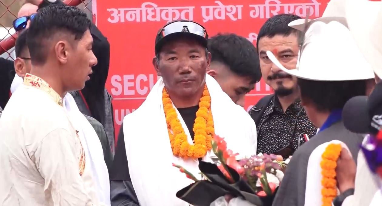 लुक्लाबाट अपराह्न काठमाडौँ आइपुगेका कीर्तिमान आरोही शेर्पालाई त्रिभुवन अन्तर्राष्ट्रिय विमानस्थलको आन्तरिक टर्मिनल भवन परिसरमा भव्य स्वागत गरिएको थियो । उनलाई पर्वतारोही, पर्यटन व्यवसायीलगायतले स्वागत गरेका हुन् ।