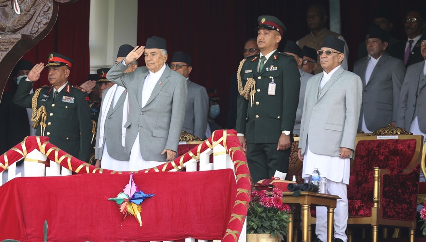 काठमाडौ । राष्ट्रपति रामचन्द्र पौडेल १६औँ गणतन्त्र दिवसका अवसरमा सैनिक मञ्च टुँडिखेलमा आयोजित विशेष समारोहमा सरिक भए।
