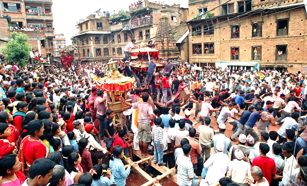 स्थानीय वृद्धवृद्धाको भनाइमा पूर्णिमाको दिन भद्रकालीले ६४ योगिनीको एउटै रुपधारण गरी कामोत्तेजक भई महादेवलाई लखेट्छिन् । महादेव त्रिवेणीमा हामफाली लुक्छन् तर त्यहाँ पनि भद्रकालीले नछाडेपछि महादेवले उन्मत्त भैरवको रुपधारण गरी भद्रकालीलाई भगाउँछन् । भाग्ने र पिछा गर्ने कार्यका रुपमा रथ जुधाइन्छ ।