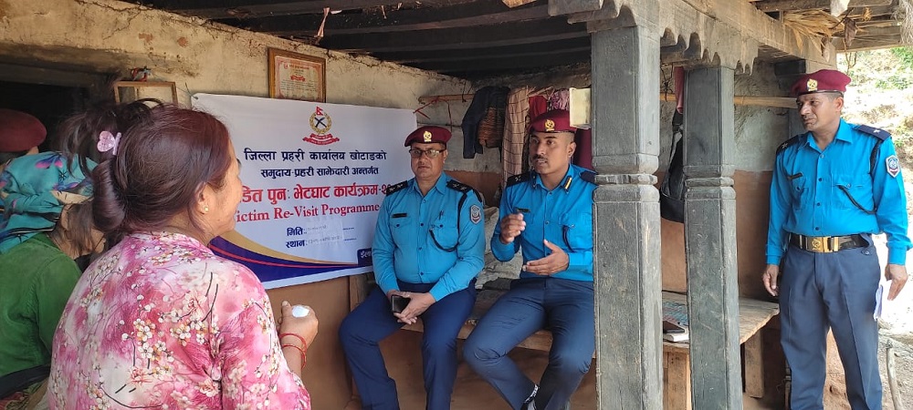 जिल्ला प्रहरी कार्यालय खोटाङले प्रदेश प्रहरी कार्यालय विराटनगरबाट अनुमति लिएर ‘पीडितसँग पुनः भेटघाट’ कार्यक्रम शुरु गरेको छ । जिल्लाका १० स्थानीय तहमा ११ जना फोकल पर्सन तोकर कार्यक्रम शुरु गरिएको जिल्ला प्रहरी कार्यालय खोटाङका डिएस्पी मञ्जिल मुकारुङले बताए ।