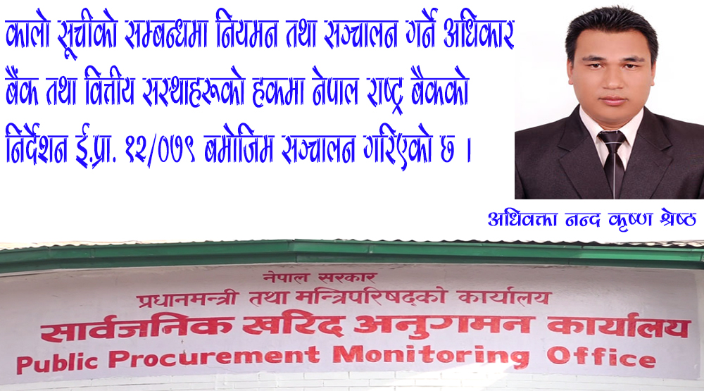 यस कालो सूचीको सम्बन्धमा नियमन तथा सञ्चालन गर्ने अधिकार बैंक तथा वित्तीय सस्थाहरूको हकमा नेपाल राष्ट्र बैकको निर्देशन ई.प्रा. १२/०७९ बमोजिम सञ्चालन गरिएको छ ।