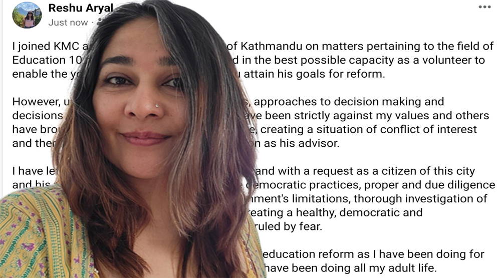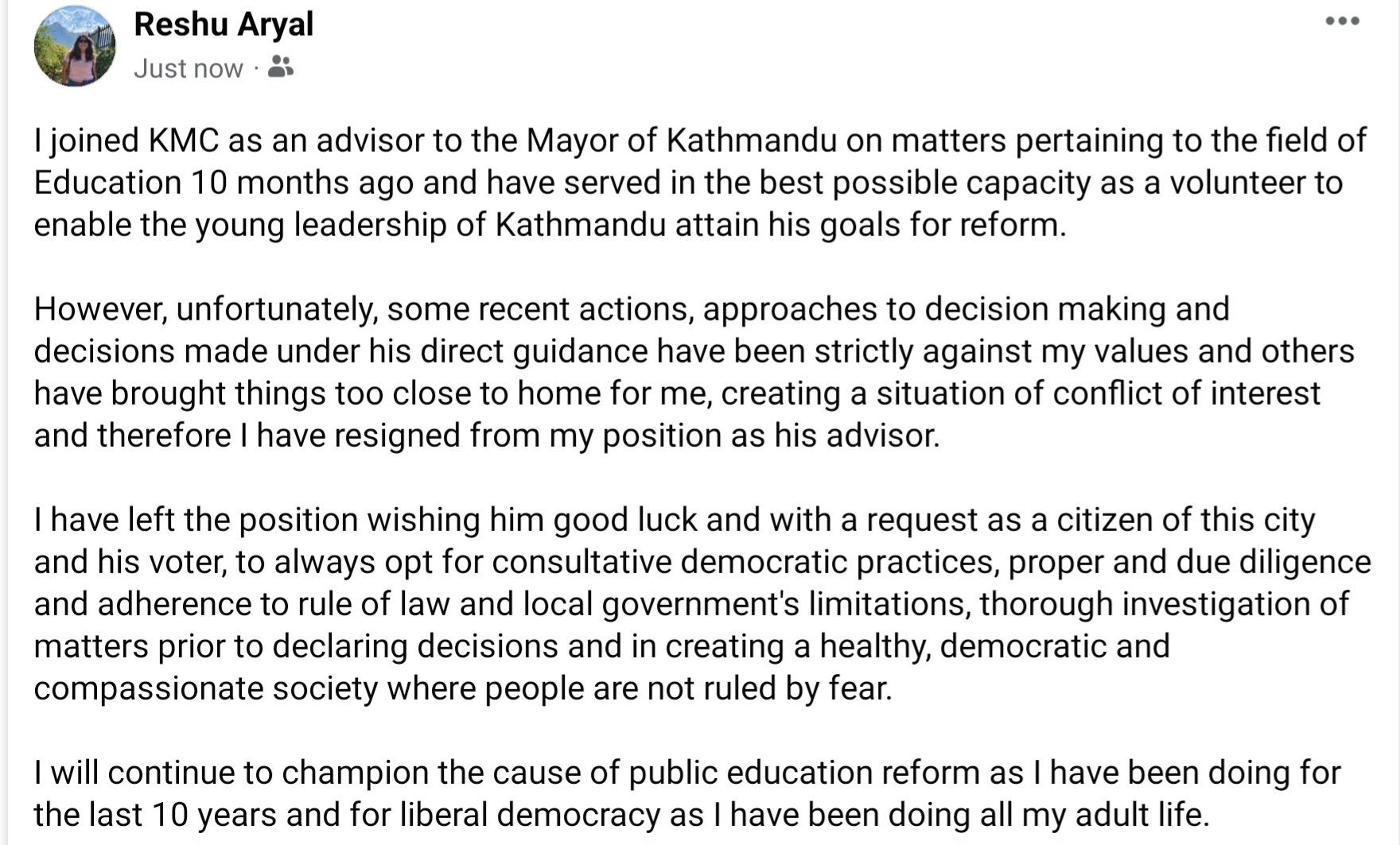 काठमाडौं । काठमाडौं महानगरपालिकाको शैक्षिक मामिला सल्लाहकार रेशु अर्यालले राजीनामा दिएकी छन् । मेयर बालेन शाहका पछिल्ला गतिविधिप्रति असहमति जनाउँदै उनले राजीनामा दिएकी हुन् ।