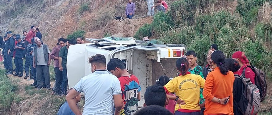 जिल्ला प्रहरी कार्यालयका सूचना अधिकारी प्रहरी निरीक्षक धर्मेन्द्र खड्काका अनुसार जिप दुर्घटनामा परेर दश जना घाइते भएका छन् ।