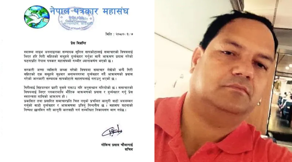 काठमाडौं । स्वास्थ्य लाईभ अनलाईनका सम्पादक सुनिल सापकोटामाथि भएको आक्रमणको प्रयासलाई लिएर नेपाल पत्रकार महासंघले आपत्ति जनाएको छ ।