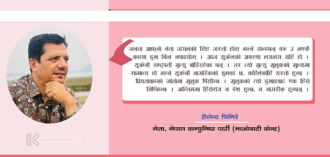 आज युक्रेनको अवस्था लगभग यही हो । युक्रेनी राष्ट्रपति मृत्यु बाँडिरहेका छन् । तर त्यो मृत्यु मुलुकको मूल्यमा सामान्य हो भन्ने युक्रेनी नागरिकको बुझाइ छ । कहिलेकाहीँ यस्तो हुन्छ, लोकप्रियतावादको जाँतोमा मुलुक पिसिन्छ । मुलुकको त्यो दुखाईबाट एक हिरो निष्किन्छ । अन्तिममा हिरोसँग न देश हुन्छ, न नागरिक हुन्छन् र जमिनका लागि योगदानको अपेक्षा राख्नेहरू नै । समयको यो क्रूरता नबुझ्नेले न नेतृत्व गर्न सक्छ न त मुलुकलाई पार लगाउन नै । यो भीषण बाढीको मध्य खोलामा हात छोडी दिने कुरा हो जो सबैका लागी घातक छ ।