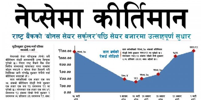 \"nepch-660x330\"अाजकाे नयाँ पत्रिका दैनिकमा सुदीपकुमार ढुंगाना लेख्छन् : काठमाडौं । नेपालको सेयर परिसूचक (नेप्से) सबै कीर्तिमान तोड्दै हालसम्मकै उच्च बिन्दुमा पुगेको छ । नेपाल राष्ट्र बैंकले बैंक तथा वित्तीय संस्थालाई नाफाबाट नगद लाभांश बाँड्न नपाउने र बोनस सेयर दिनुपर्ने गरी निर्देशिका जारी गरेपछि बुधबार नेप्सेले नयाँ कीर्तिमान बनाएको हो ।