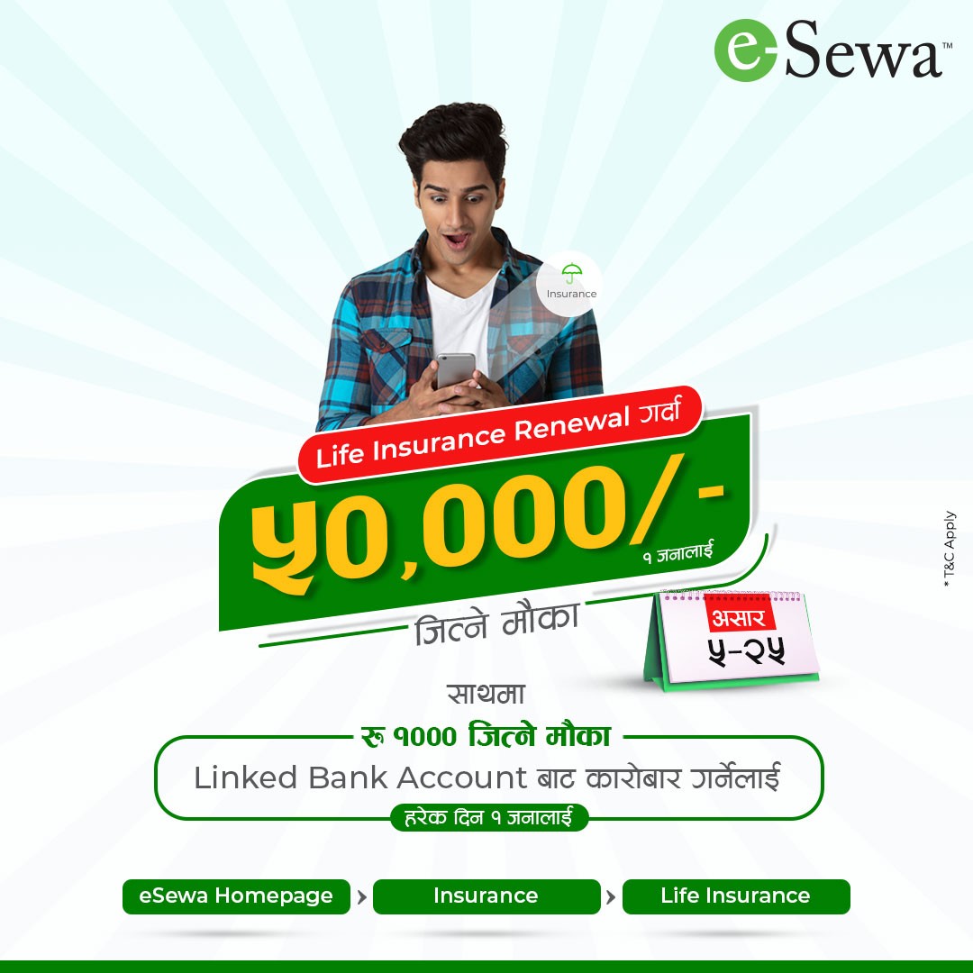 काठमाडौं । नेपालको पहिलो र अग्रणी भुक्तानी सेवा प्रदायक इसेवा मार्फत लाइफ इन्स्योरेन्स्को नविकरण गर्दा ५० हजार जित्न सकिने भएको छ ।