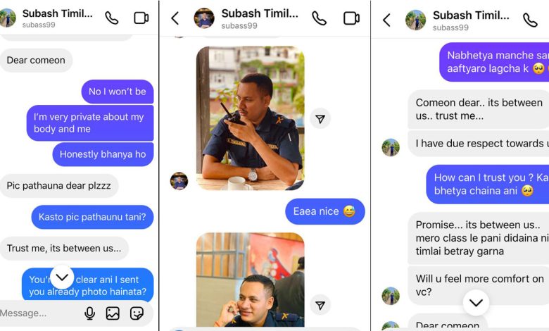 ‘अब बोल्ने’ नामक ट्विटर ह्याण्डलमार्फत सार्वजनिक भएको स्क्रिनसटमा तिमिल्सिनाले पिडित महिलालाई तिम्रो शरीरको फ्यान हुँ भन्दै तस्विर पठाउन भनेका छन् । ट्विटर ह्याण्डलमा स्क्रिनसट पोष्ट गर्दै पीडित महिलाले लेखेकी छन् ‘नेपाल प्रहरीको शक्तिमार्फत सुरक्षा सेवकले नै महिलामा असुरक्षा सिर्जना गरिरहेका छन्।’