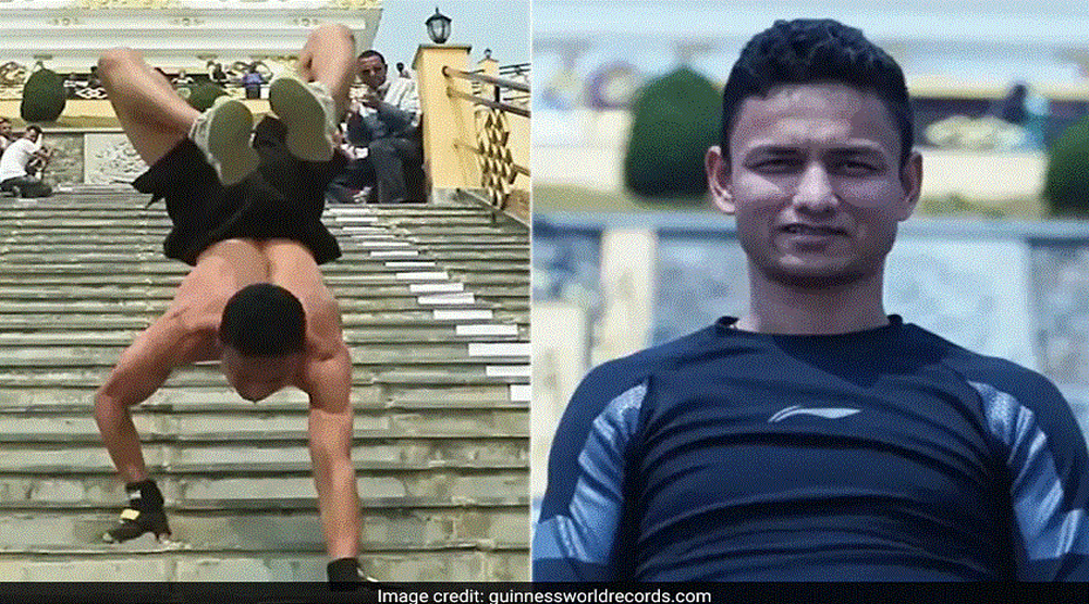 २९ वर्षीय नेपाली युवा हरिचन्द्र गिरीले खुट्टा माथि र टाउको तल पारेर दुबै हातले सिँढी ओर्लिएर गिनिज बुकमा आफ्नो नाम लेखाएका हुन् । नेपाल आर्मीमा कम गर्ने गिरीले हातले हिँडेर सबैभन्दा कम समयमा ७५ वटा सिँढी ओर्लिएका थिए ।