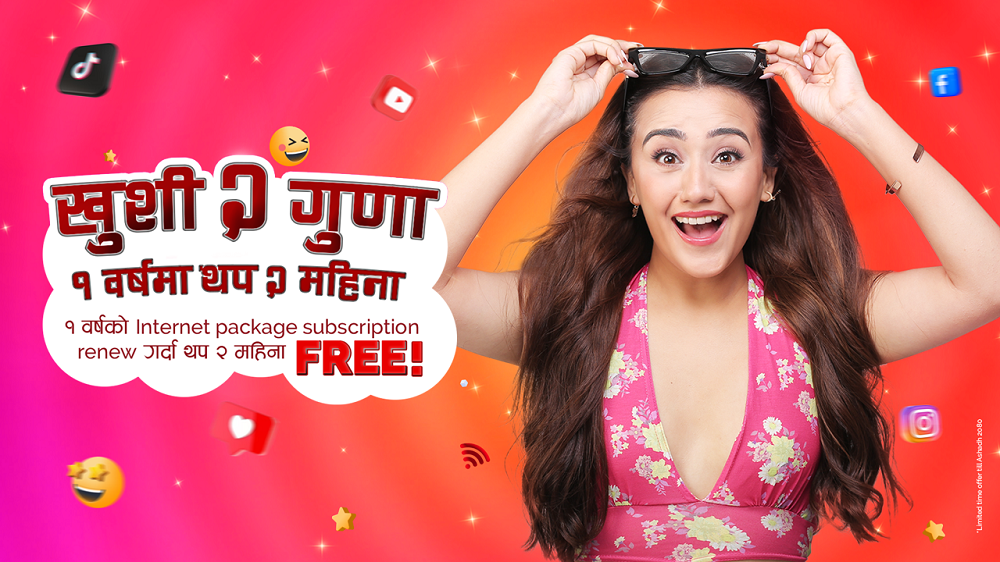 यस अन्तरगतभायानेटकोकुनै पनि इन्टरनेट प्याकेजकोवार्षिक सदस्यता नवीकरण गरेर, ग्राहकहरूले २ महिनाको निःशुल्क इन्टरनेट सेवाको बोनस प्राप्त गर्नेछन्। यो अफर असार २०८० सम्ममात्र उपलब्ध रहने छ।