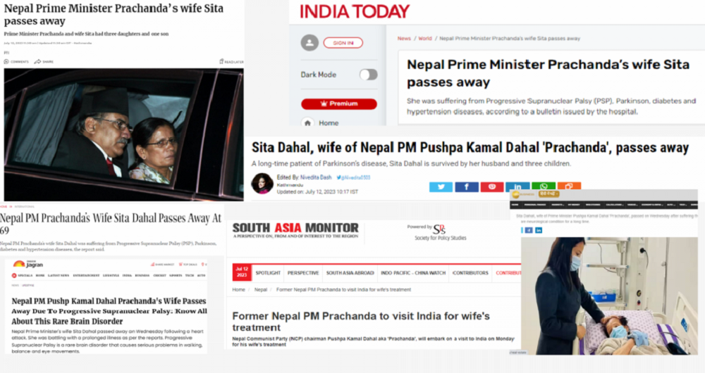काठमाडौं । प्रधानमन्त्री पुष्प कमल दाहाल प्रचण्ड पत्नी सीता दाहालको निधनलाई भारतीय संचार माध्यमले प्राथमिकतका साथ छापेका छन् ।