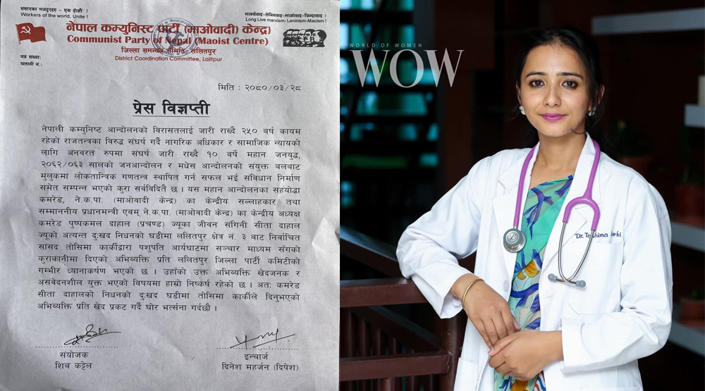 बिहिवार पार्टी कार्यलयले एक विज्ञप्ती जारी गदै बुधवार सिता दाहाललाई अन्तीम श्रद्धाञ्जली दिन पुगेकी ललितपुर क्षेत्र नं. ३ बाट निर्वाचित सांसद तोसिमा कार्कीले पशुपति आर्यघाटम सञ्चार माध्यम सँगको कुराकानीमा दिएको अभिब्यक्ति प्रति खेद प्रकट गर्दै घोर भत्र्सना गरेको हो । कार्काीले दिएको अभिब्यक्ति असंवेदनशील रहेको निष्कर्ष जारी प्रेस विज्ञप्तीमा उल्लेख गरिएको छ ।
