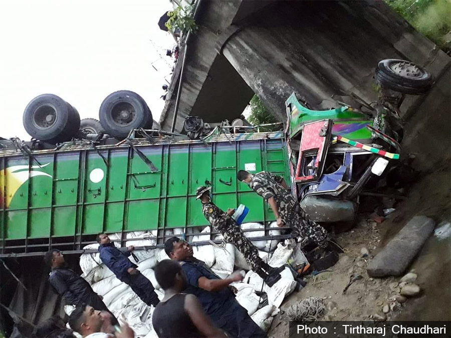 ट्रक पुलको रेलिङ भाँच्दै खोलामा खसेको छ । नेपाल प्रहरी र नेपाली सेनाको टोली उद्धारमा खटिएका छन् ।