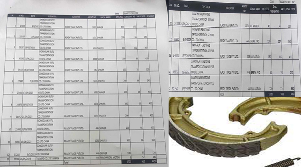 कम्पनीकाे नााममा १५ पटक ब्रेक प्याड, १२ पटक सेभर र एक पटक मेकानिकल मोटर रेडी ट्रेडले आयात गरेकोत्रिभुवन विमानस्थल भन्सार कार्यालयका प्रवक्ता अम्बिकाप्रसाद खनालले जानकारी दिए ।
