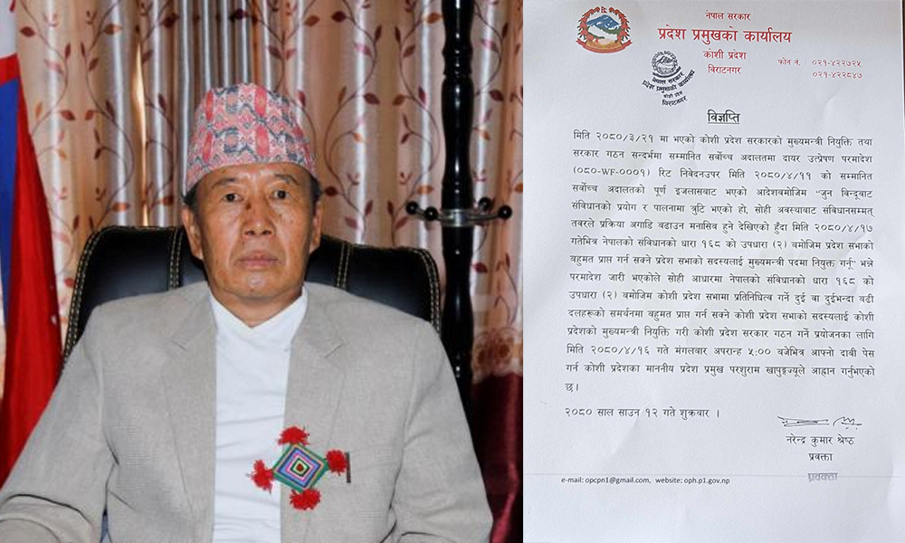 उनले संविधानको धारा १६८ कोउपधारा ९२० बमोजिम कोशी प्रदेशसभामा प्रतिनिधित्व गर्ने दुई वा दुईभन्दा बढी दलहरूको समर्थनमा बहुमत प्राप्त गर्न सक्ने कोशी प्रदेशसभाको सदस्यलाई कोशी प्रदेशको मुख्यमन्त्री नियुक्ति गरी कोशी प्रदेश सरकार गठन गर्ने प्रयोजनका लागि दाबी पेस गर्न आह्वान गरेका हुन् ।