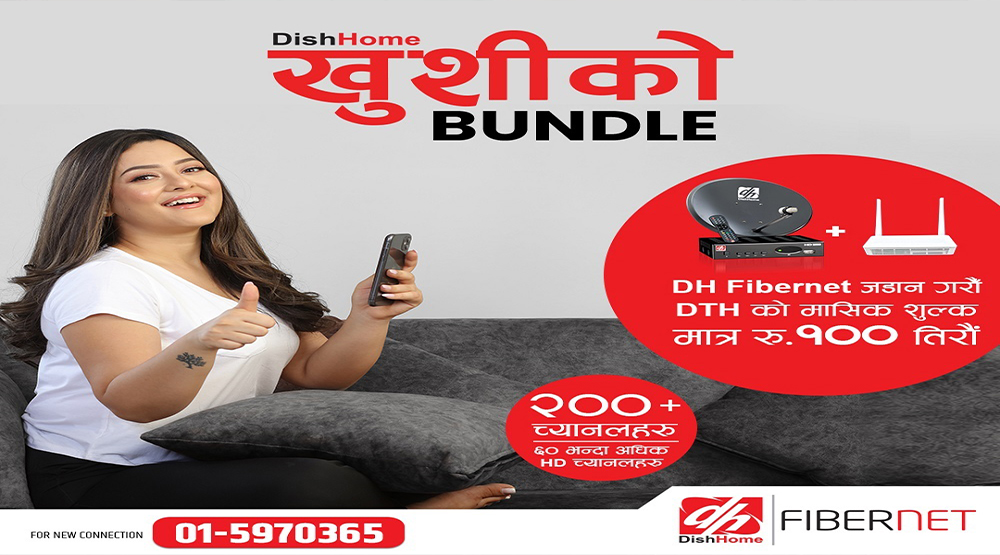 डिशहोम फाईवर नेटको नयाँ जडानमा डिशहोम टिभीको कनेक्सनगरि यो अफरको लाभ उठाउन सकिनेछ । यस्तै यो अफरको लाभपहिले देखि डिशहोम टिभी मात्र प्रयोग गरि रहेका ग्राहकले फाईवर नेटको कनेक्सन लिएर लिन सक्ने डिशहोमले जनाउको छ ।