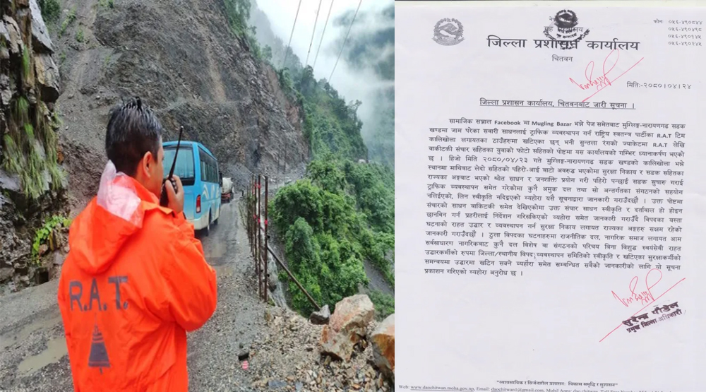 सूचनामा भनिएको छ, ‘पहिरो पन्छाई सडक सञ्चालन भइसकेको र ट्राफिक व्यवस्थापनसमेत नियमित रुपमा भइरहेकामा कुनै अमुक दल वा सोअन्तर्गतका संगठनको सहयोग नलिइएको र लिन स्वीकृति पनि नदिइएको जानकारी गराइन्छ ।’ रास्वपा आबद्ध युवाले आरएटी लेखिएको सञ्चार उपकरण वाकिटकी सहित फोटो सामाजिक सञ्जालमा पोष्ट गरेको देखिएकामा पहिरो पन्छाउँदा प्रयोग गरिएका उक्त सामग्री स्वीकृति र दर्ता भए-नभएको समेत छानबिन गर्न प्रहरीलाई निर्देशन दिइएको सूचनामा जनाइएको छ ।
