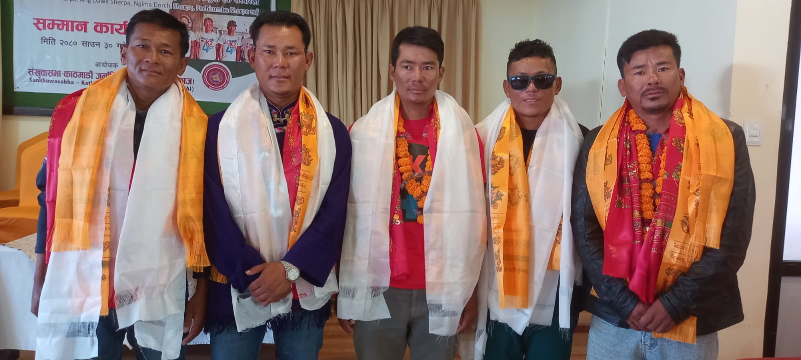 काठमाडौं। संसारको दोस्रो अग्लो हिमाल माउन्ट केटुको सफल आरोहण गर्ने एकै परिवारका चार दाजुभाइलाई सरकारले सम्मान गरेको छ । मङ्गलवार काठमाडौंमा एक कार्यक्रमका बीच सरकारले संखुवासभाका सफल आरोही दाजुभाइ मुक्त शेर्पा, निङ्मा दोर्ची शेर्पा,पेचुम्बे शेर्पा र आङदावा शेर्पालाई कदर पत्र र खादा ओढाएर सम्मान गरेको हो ।