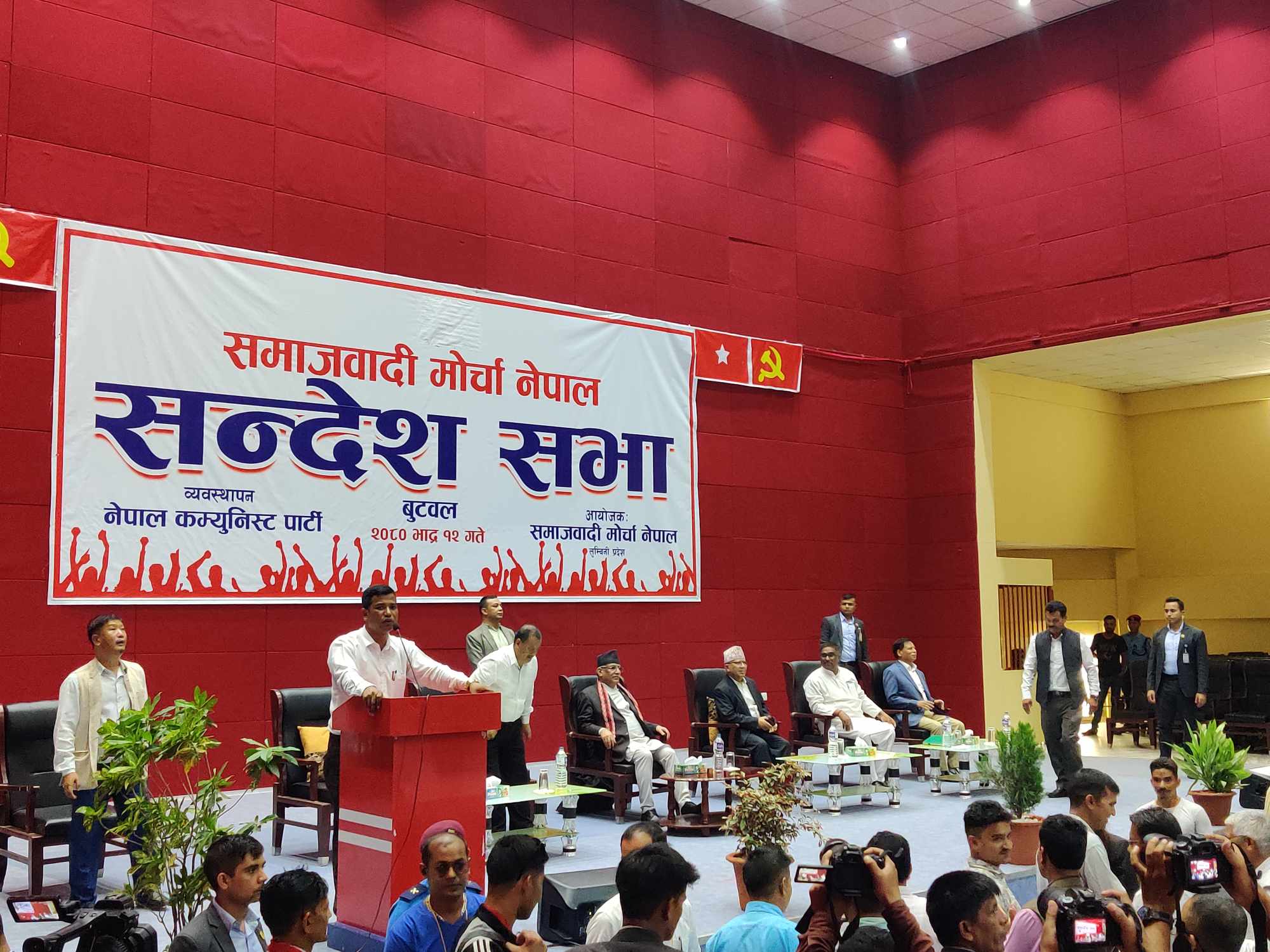 रुपन्देही । बुटवलमा समाजवादी मोर्चा नेपालको सन्देश सभा सुरु भएको छ । अन्तर्राष्ट्रिय सम्मेलन केन्द्रमा मंगलबार दिउँसो सन्देश सभा सुरु भएको हो ।