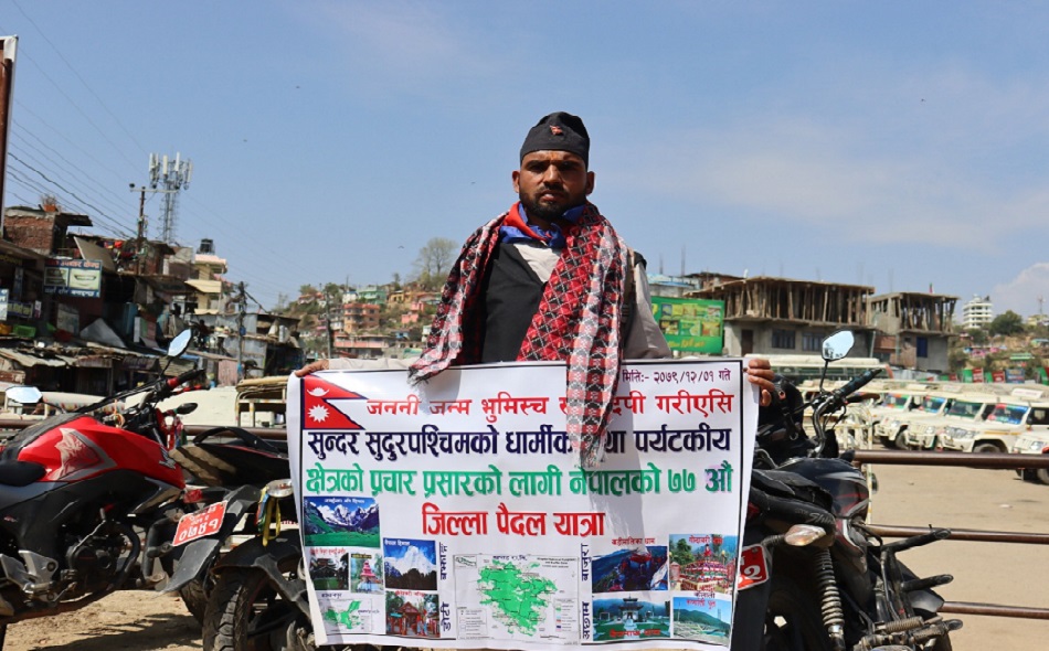 कञ्चनपुर । सुदूरपश्चिमका पर्यटकीय क्षेत्रको प्रचारप्रसारका लागि कैलालीको गौरीगंगा नगरपालिकाका एक युवकले मुलुकका ७७ वटै जिल्लाको पैदलयात्रा सुरु गरेका छन् । आइतबार साँझ कञ्चनपुरको महेन्द्रनगर पुगेका कैलालीको गौरीगंगा नगरपालिका–४ का देवराज पाध्याले यहाँ पुगेर यात्रा समापन गरेका हुन् ।
