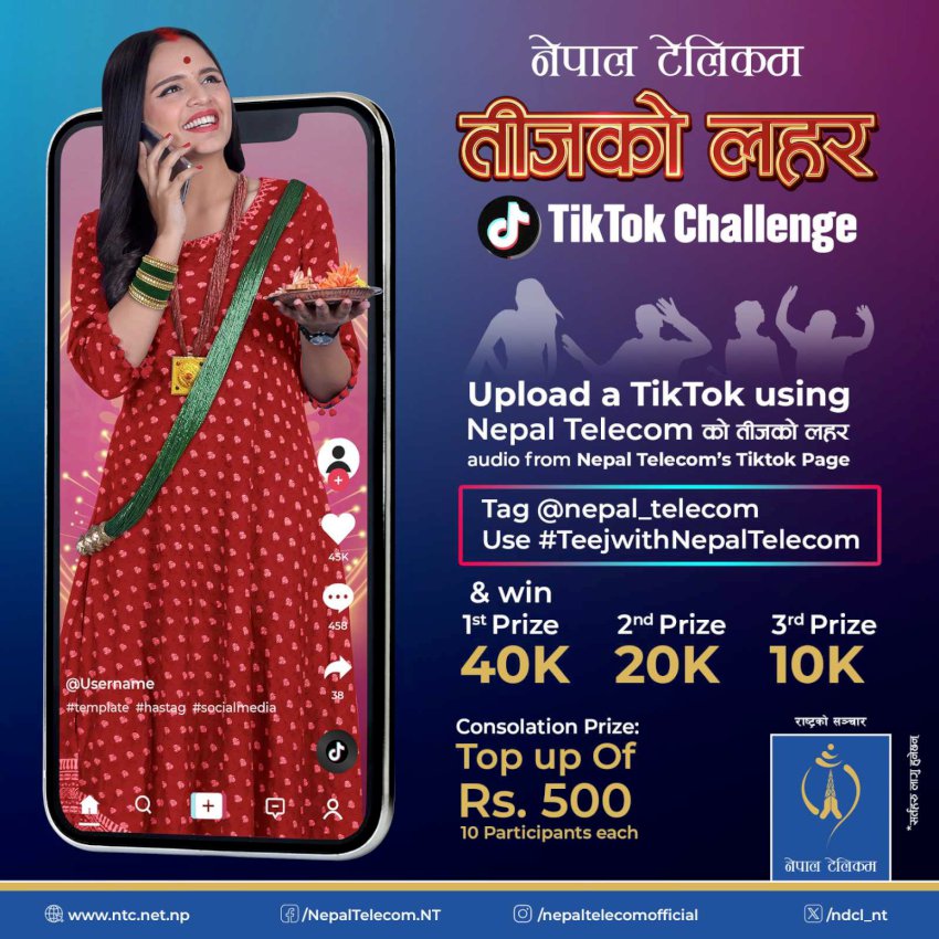 नेपाल टेलिकमको तीजको लहर गीतमा टिकटक बनाई यसमा सहभागी हुन सकिने छ । सो च्यालेन्ज हिजो भाद्र २४ देखि प्रारम्भ भएको छ र आगामी असोज ७ गते सम्म सहभागी हुन सकिने छ । विजेताहरुलाई नगद र अन्य पुरस्कारको व्यवस्था गरिएको छ । यस अनुसार सो च्यालेन्जमा पहिलो हुने विजेताले ४० हजार, दोस्रोले २० हजार र तेस्रोले १० हजार नगद पुरस्कार पाउने छन् । त्यसैगरी सान्त्वना पुरस्कारको रुपमा १० जना सहभागीलाई रु. ५०० को टप अपप्रदान गरिने जनाएको छ ।