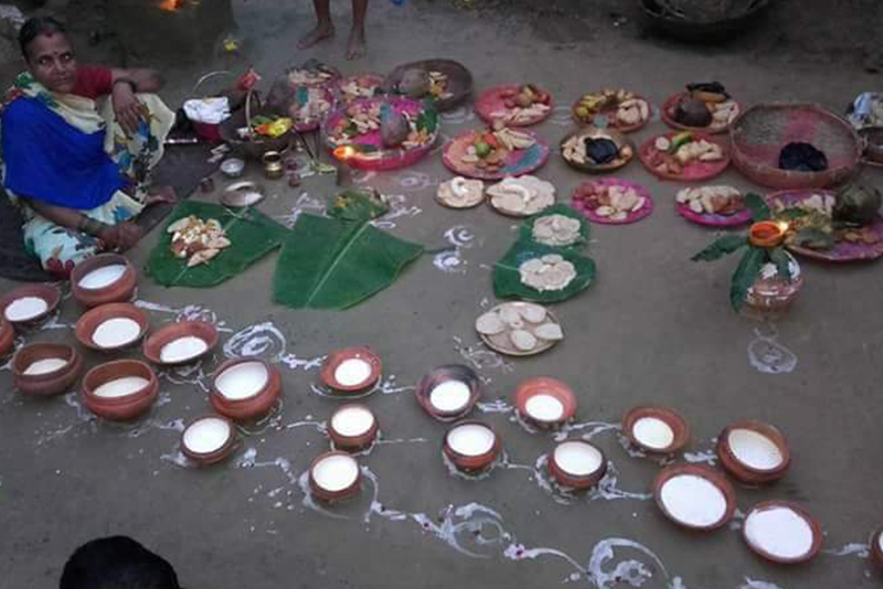 उनका अनुसार खासगरी आँगनमा पूजा हुने भएकाले चामलको पीठोको कलात्मक अरिपन बनाई, त्यसमाथि पूजाका सामग्री राखेर धार्मिक विधिपूर्वक पूजापाठ गरिन्छ। त्यसक्रममा नयाँ माटोका भाँडाको दही, केरा, मिठाई, फलफूलका साथै विभिन्न प्रकारका पकवान राखेर विभिन्न देवी–देवतालाई चढाइने गरिन्छ।