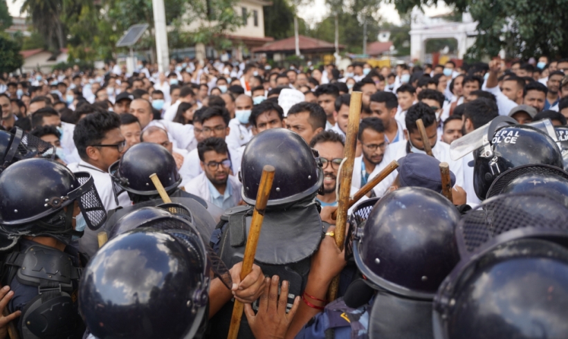 काठमाडौँ । पोखरास्थित मणिपाल शिक्षण अस्पतालका चिकित्सकमाथि हातपात भएको विरोधमा प्रदर्शनरत चिकित्सक, स्वास्थ्यकर्मी र प्रहरीबीच धकेलाधकेल भएको छ ।मंगलबार चिकित्सकहरूले माइतीघरमा शान्तिपूर्ण प्रदर्शन गरिरहेका बेला उनीहरुबीच धकेलाधकेल भएको हो ।