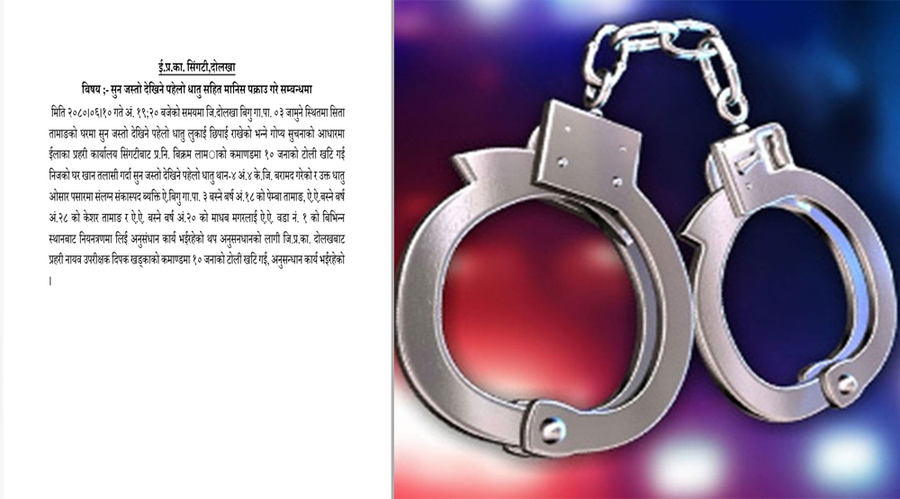 उनको साथबाट चार किलो सुनपनि बरामद भएको प्रहरीले जनाएकाे छ । उनलाई सोधपुछपछि अन्य दुई जनापनि पक्राउ परेका हुन् । उनीहरुमाथि थप अनुसन्धान भईरहेको प्रहरीले जनाएको छ । पक्राउ परेकाहरुबारे पत्रकार सम्मेलनको आयोजना गरी बिस्कृत बिवरण सार्वजनिक गर्ने दाेलखा प्रहरीले जनाएको छ ।
