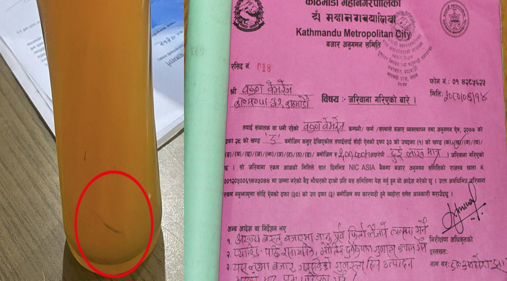 काठमाडौं । स्लाइसको बोतलमा कालो लेदो भेटिएपछि काठमाडौं महानगरले वरुण वेभरेजलाई २ लाख जरिवाना गरेको छ ।