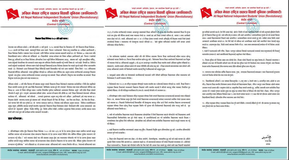 काठमाडौं । नेकपा माओवादी केन्द्र निकट अनेरास्ववियु(क्रान्तिकारी)ले संसदमा पेश भएको विद्यालय शिक्षा विधेयक २०८०का विषयमा १३ बुँदे धारणा सार्बजनिक गरेको छ ।