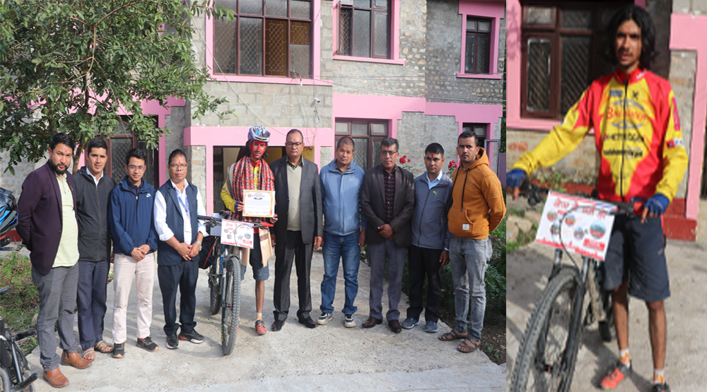 सल्यान । सल्यानका एक युवाले पर्यटन प्रवद्र्धनका लागि भन्दै काठमाण्डौँ देखि सल्यान सम्मको साईकल यात्रा पुरा गरेका छन् । सल्यानका निषेध दाहालले आफ्नो क्षेत्रका धार्मिक, ऐतिहासिक तथा पर्यटकीय स्थलको प्रवद्र्धन र प्रचारप्रसारका लागि ५०९ किलोमिटर भन्दा बढी लामो साईकल यात्रा गरेका हुन् ।