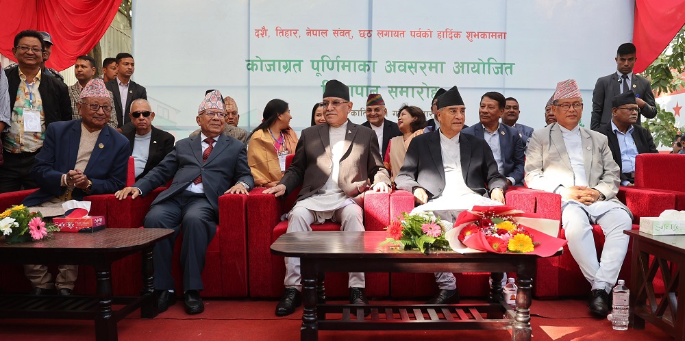 काठमाडौँ । नेपाली कांग्रेसले आयोजना गरेको शुभकामना तथा चियापान कार्यक्रममा नेकपा माओवादी केन्द्रका अध्यक्ष एवम् प्रधानमन्त्री पुष्पकमल दाहाल प्रचण्ड लगायतका माओवादी नेताहरु सहभागी भएका छन् । शनिबार सानेपामा आयोजित कार्यक्रममा प्रधानमन्त्री प्रचण्ड, नेताहरु जनार्दन शर्मा, अग्नि सापकोटा, लगायतका नेताहरु सहभागी भएका हुन् ।
