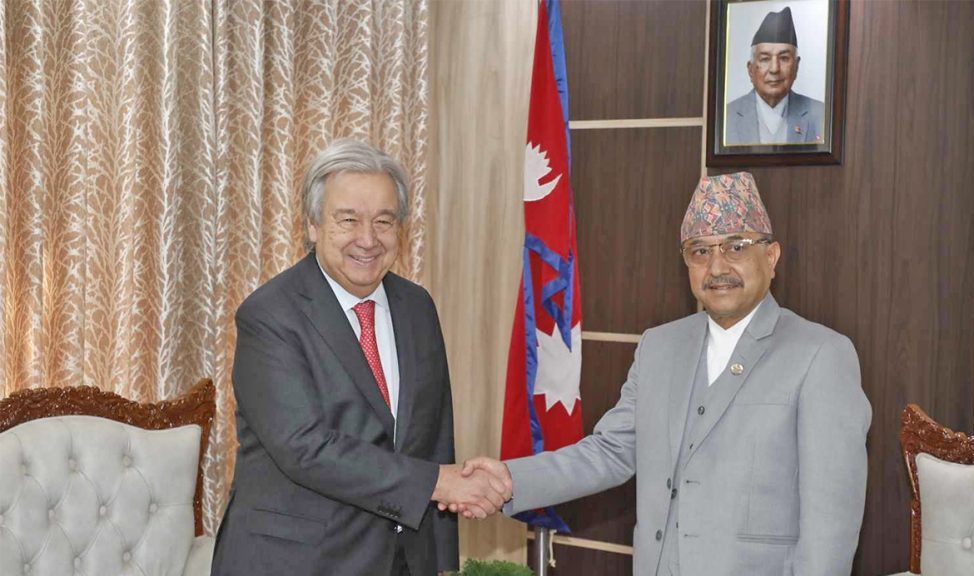 आइतबार सिंहदरबारमा महासचिव गुटरेस र उपप्रधान तथा रक्षामन्त्री खड्काबीच भेटवार्ता भएको हो । मन्त्री खड्कासँगको भेटवार्ताअघि गुटरेसले परराष्ट्रमन्त्री एनपी साउदसँग सिंहदरवारमै भेटवार्ता गरेका थिए ।