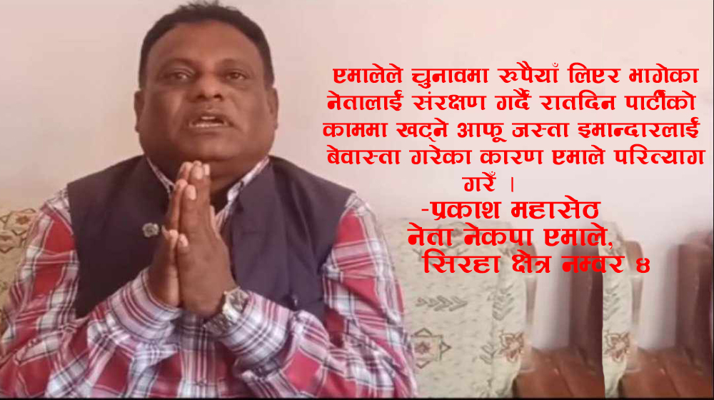 सिरहा । सिरहा क्षेत्र नम्वर ४ (क)का प्रत्याशी उम्मेदवार प्रकाश महासेठ नेकपा एमाले परित्याग गरेका छन् । महासेठले मिर्चैयामा पत्रकार सम्मेलन गरी एमाले पार्टी परित्याग गरेको घोषणा गरेका हुन् ।