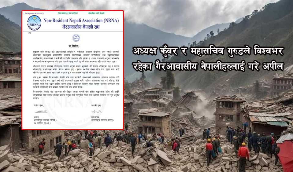 काठमाडौँ । गैरआवासीय नेपाली संघ (एनआरएनए) ले भूकम्प पीडितको राहत र उद्दार तथा सहयोगको लागि अपील गरेको छ । संघका अध्यक्ष विनोद कुँवर र महासचिव जानकी गुरुङले विज्ञप्ति जारी गर्दैविश्वभर फैलिएका राष्ट्रिय समन्वय परिषद्लाई सहयोगको लागि अपील गरेका छन् ।