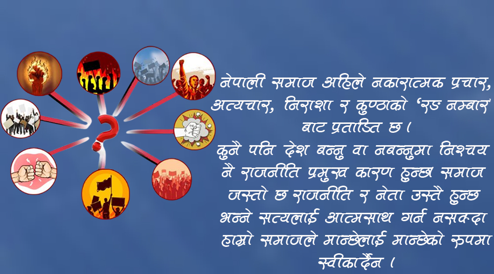 नेपाली समाज अहिले नकारात्मक प्रचार, निराशा कुण्ठा र अत्यचारको ‘रङ नम्बार’ बाट प्रताडित छ । कुनै पनि देश बन्नु वा नबन्नुमा निश्चय नै राजनीति प्रमुख कारण हुन्छ। समाज जस्तो छ राजनीति र नेता उस्तै हुन्छ भन्ने सत्यलाई आत्मसाथ गर्न नसक्दा हाम्रो समाजले मान्छेलाई मान्छेको रूपमा स्वीकार्दैन ।
