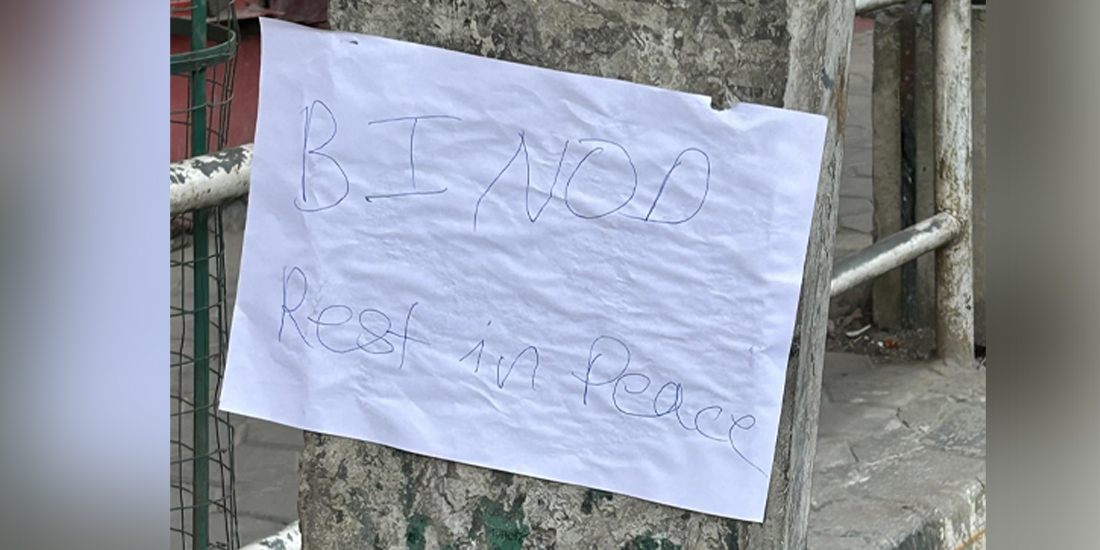 काठमाडौं । शनिबार बिहान काठमाडौं महानगरपालिका- १३ सोल्टीमोडमा एकाबिहानै एक व्यक्ति सडक पेटीमा मृत भेटिए । घटनास्थलभन्दा करिब सय मिटर नजिकै बिजुलीको पोलमा एउटा कागज टाँसिएको थियो । जसमा लेखिएको थियो- ‘विनोद, रेस्ट इन पिस’।