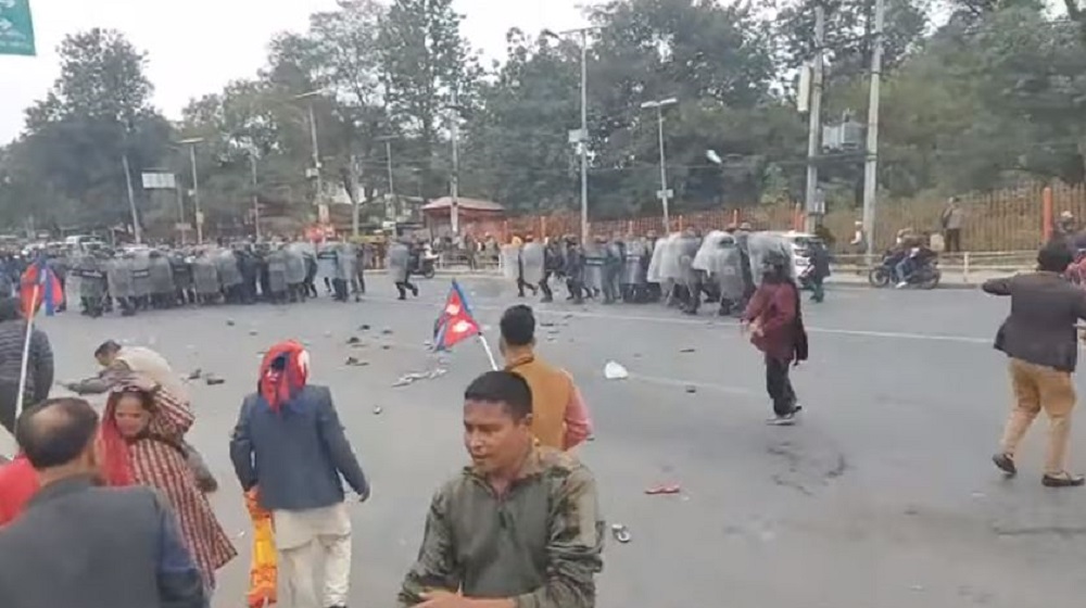 काठमाडौँ । गौशालामा दुर्गा प्रसाई नेतृत्वको ‘राष्ट्र, राष्ट्रियता, धर्म, संस्कृति र नागरिक बचाउँ महाअभियान’मा सहभागी प्रदर्शनकारी र प्रहरीबिच झडप भएको छ । प्रदर्शनकारीले प्रहरीमाथि ढुंगा प्रहार गरेपछि झडप भएको हो ।