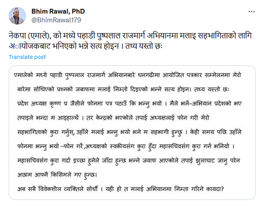‘अध्यक्षको स्वकीयसँग कुरा हुँदा महासचिवसँग कुरा गर्न भनियो, महासचिवसँग कुरा गर्दा इच्छा हुनेले जाँदा हुन्छ भन्ने जवाफ आएकोले तपाईं झुलाघाट जानु परेन अछाम आफ्नै किसिमले गए हुन्छ,’ रावलले जैसीको भनाई उद्धृत गर्दै लेखेका छन्, ‘अब सबै विवेकशील व्यक्तिले सोचौँ, यही हो त मलाई अभियानमा निम्ता गरिने कायदा?’ रावलले अध्यक्ष ओलीले निम्तो गरे आफू कार्यक्रममा सहभागी हुने सन्देश पठाएका थिए । रावलले प्रदेशको अभियान भए प्रदेश अध्यक्ष जैसीले निमन्त्रणा गर्दा कार्यक्रममा सहभागी हुने उल्लेख गरेका छन् ।