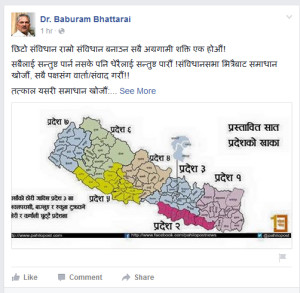 \"baburam\"काठमाण्डौ । नयाँ बन्ने संविधानमा सिमांकन लगायतका विवादित विषयलाई टुंग्याउन भन्दै एकीकृत नेकपा माओवादीका वरिष्ठ नेता डा. बाबुराम भट्टराईले फेसबुक मार्फत प्रस्ताव गरेका छन् । सोमबार विहान उनले गरेको पोष्टमा सबैलाई सन्तुष्ट पार्न नसके पनि धेरैलाई सन्तुष्ट पार्नुपर्ने भन्दै संविधानसभा भित्रैबाट वार्ता र संवाद मार्फत समाधान खोज्नु पर्ने उल्लेख गरेका छन् । संसदमा प्रस्तुत परिमार्जित विधेयकलाई दलहरुको सहमतिमा संसोधन हालेर परिमार्जन गर्ने ठाउँ र समय बाँकी भएको भन्दै फुटेर नभई जुटेर देशलाई छिटो निकास दिनुपर्ने धारणा उनले व्यक्त गरेका छन् । विवादित विषय समाधानका लागि उनले निम्न प्रस्ताव प्रस्तुत गरेका छन् । तत्काल यसरी समाधान खोजौं : १. सीमांकन : ७ प्रदेशको मोडेल भित्रै प्रदेश–१ को मधेसी÷थारु बाहुल्य क्षेत्र प्रदेश–२ मा राख्ने, प्रदेश–५ को मगर वाहुल्य क्षेत्र प्रदेश–४ मा राख्ने, प्रदेश–७ को थारु वाहुल्य क्षेत्र प्रदेश–५ मा राख्ने । २. नागरिकता : पुरुषको विदेशी दम्पत्तिलाई झैं महिलाको विदेशी दम्पत्तिलाई पनि (आवश्यक परे थप शर्त सहितं) अंगीकृत नागरिकता र एकल महिलाका सन्तानलाई सहज नागरिकता दिने व्यवस्था गर्ने । ३. महिला र दलितलाई निश्चित प्रतिसत प्रत्यक्ष निर्वाचन क्षेत्र छुट्याउने । ४. देशमा परिवर्तनको वास्तविक अनुभुति गराउन र राजनीतिक स्थीरता कायम गर्न प्रत्यक्ष निर्वाचित कार्यकारी प्रमुखको व्यवस्था गर्ने । ५. नेपाली समाजको वहुधार्मिक चरित्र र लामो धार्मिक सहिष्णुताको परम्परा कायम गर्दै राज्यलाई धर्मनिरपेक्ष राख्ने । ६. न्याय प्रणाली, संवैधानिक आयोग लगायत अन्य विषयमा सहमतिले आवश्यक परिमार्जन गर्ने ।