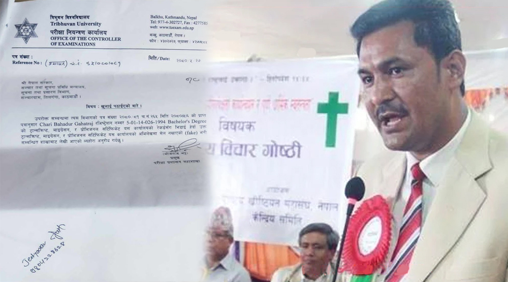 काठमाडौं । नक्कली सर्टिफिकेट प्रकरणमा राष्ट्रिय ख्रीष्टियन महासंघ नेपालका अध्यक्ष चरीबहादुर (सीबी) गहतराज पक्राउ परेका छन् । स्नातक तहको नक्कली सर्टिफिकेट बनाएर दुरुपयोग गरेको आरोपमा प्रहरीले मंगलबार गहतराजलाई पक्राउ गरेको हो ।