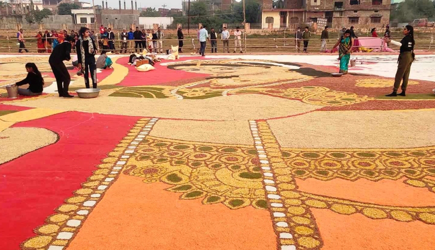 धनुषा । विवाहपञ्चमीको अवसरमा रङ्गभूमि मैदानमा ११ हजार स्क्यावर फिटभन्दा ठुलो सीतारामको आकृति तयार गरिएको छ ।