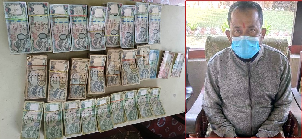 बरामद भएको रकममा एक हजार दरको ८८५ थान, पाँच सय दरको १६९ थान, एक सय दरको ९०० थान, पचास दरको ५ थान, बिस दरको १२ थान र दश दरको नोट १ थान रहेको छ ।