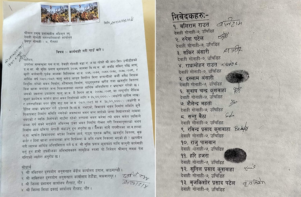उनीहरुले उजुरीको बोधार्थ अख्तियार दुरुपयोग अनुसन्धान आयोग,जिल्ला प्रशासन कार्यालय र जिल्ला शिक्षा इकाइ कार्यालय रौतहटलाई दिएका छन् ।