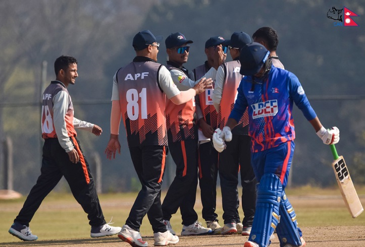 काठमाडौँ । एपीएफ क्लबले जारी प्रधानमन्त्री कप पुरुष राष्ट्रिय क्रिकेट प्रतियोगितामा लगातार दोस्रो जित हासिल गरेको छ । सोमबार मुलपानी क्रिकेट मैदानमा एपीएफले कोशी प्रदेशलाई ६ विकेटले पराजित गरेको हो ।