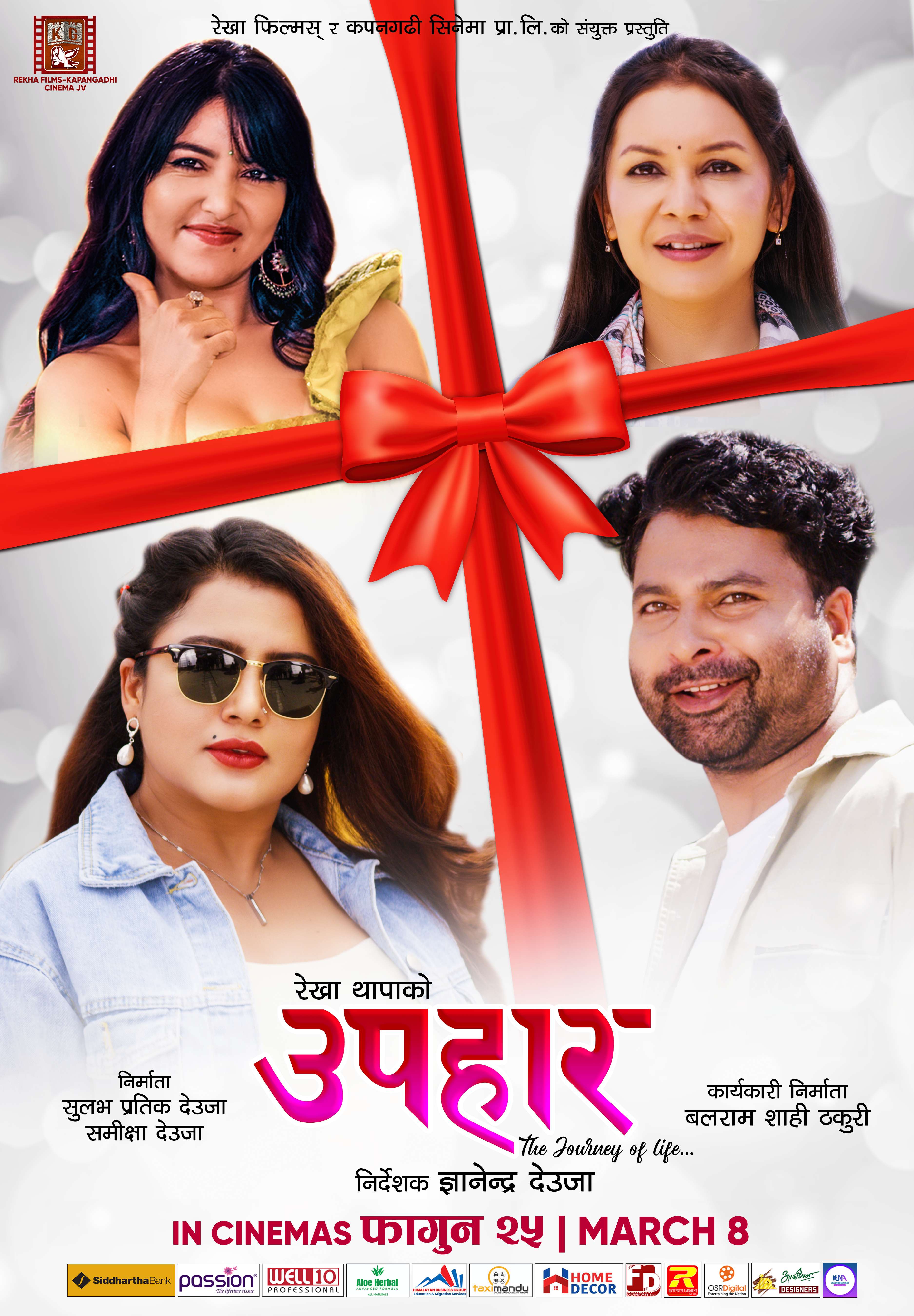 काठमाडौं । आगामी फागुन २५ गते रिलिज हुने फिल्म ‘उपहार’को चारवटा फस्टलुक पोस्टर सार्वजनिक भएको छ । निर्माण पक्षले फिल्मका प्रमुख कलाकारलाई स्थान दिँदै माघे संक्रान्तिको अवसर पारेर चारवटा फस्टलुक पोस्टर सार्वजनिक गरेको हो ।