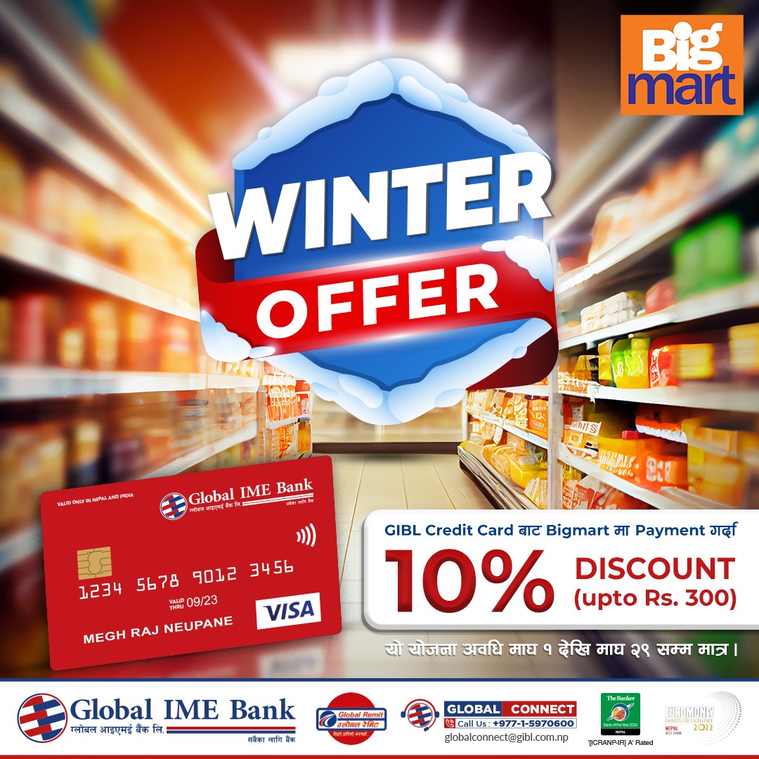काठमाडौं । जाडो मौसमलाई लक्षित गरी ग्लोबल आइएमई बैंकले बिगमार्ट विन्टर अफर ल्याएको छ । यो योजनामा बैंकका क्रेडिट कार्ड बाहकहरुले बिगमार्टमा खरिद गरी बैंकको क्रेडिट कार्ड मार्फत भुक्तानी गर्दा खरिद मुल्यमा १०% छुट पाउने भएका छन् ।