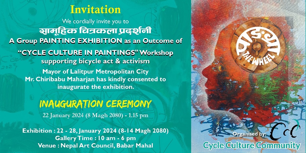 नेपालमा साइकल संस्कृतिमैत्री आधारभूत संरचना र सभ्यता स्थापनाका लागि विविध बौद्धिक–कलात्मक कार्यक्रमहरु सञ्चालन गर्दै आइरहेको साइकल कल्चर कम्युनिटीको संयोजनमा कार्यशाला सम्पन्न भई चित्रकला प्रदर्शनी आयोजना हुन गइरहेको हो । कुनै विशेष दाता तथा वैदेशिक सहायता विना एक आपसको सहयोग, सहकार्य र आर्थिक मुठ्ठीदानमार्फत रचनात्मक अभियान अघि बढाइरहेको चित्रकला कार्यशाला तथा प्रदर्शनीका कार्यक्रम संयोजक तारालाल श्रेष्ठले बताए । साइकल संस्कृति विकास र विस्तारका लागि कला, साहित्य, दर्शनसँग जोडेर सिर्जनात्मक अभियानको आवश्यकता बोध भएकाले यस चित्रकला कार्यशाला र प्रदर्शनीको आयोजना गरिएको उनले बताए ।